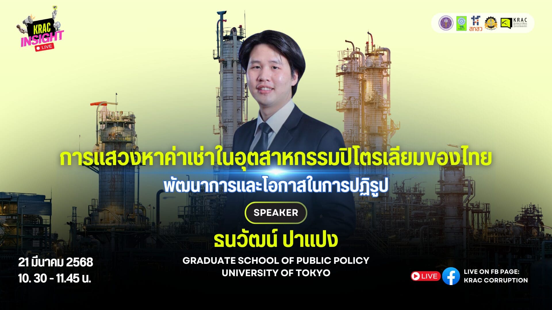 ร่วมเจาะลึกไปกับคุณธนวัฒน์ ปาแปง นักศึกษาระดับดุษฎีบัณฑิต จาก Graduate School of Public Policy, University of Tokyo โดยคุณธนวัฒน์ ปาแปง ได้อธิบายเกี่ยวกับโครงสร้างของอุตสาหกรรมพลังงานไทย และวิเคราะห์ถึงประเด็นเรื่องค่าเช่าและผลกระทบทางเศรษฐกิจ รวมถึงเสนอแนวทางปฏิรูปเพื่อความโปร่งใสและยั่งยืนของไทย