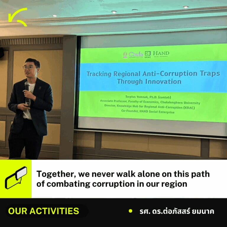 Torplus Yomnak , a KRAC director, was invited to speak at the Expert Sharing session on the topic “Tracking Regional Anti-Corruption Traps Through Innovation.” He began by emphasizing the importance of publicly accessible information as a foundation for transparency.