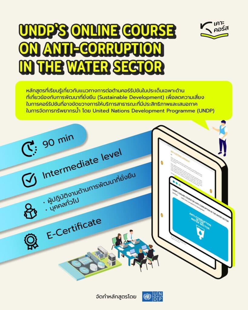 หลักสูตรออนไลน์ โดย United Nations Development Programme (UNDP) : เรียนรู้การต่อต้านการคอร์รัปชันในประเด็นด้านการบริหารจัดการน้ำอย่างมีประสิทธิภาพ และประยุกต์ใช้เครื่องมือ เพื่อลดความเสี่ยงการทุจริตในทรัพยากรน้ำ