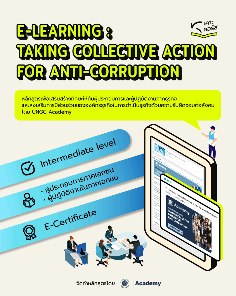 หลักสูตรออนไลน์จาก UNGC Academy : ทำความเข้าใจว่าแนวร่วมปฏิบัติ (Collective Action) ในการต่อต้านการทุจริตคืออะไร และมีประโยชน์อย่างไรต่อธุรกิจของคุณ โดยเรียนรู้ผ่านกรณีศึกษาที่ประสบความสำเร็จจากทั่วโลก เพื่อนำมาประยุกต์ใช้กับองค์กร/หน่วยงานในการป้องกันและลดความเสี่ยงการทุจริตในภาคธุรกิจอย่างเป็นรูปธรรม